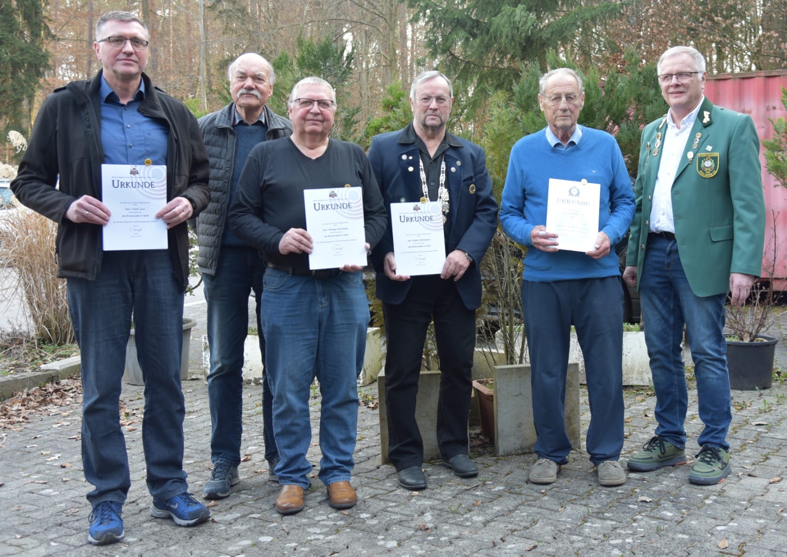 Die zur MV anwesenden und geehrten Jubilare mit dem OSM, v.l.: Frank Laux (40), Wolfgang Bauhof (25), Rüdiger Schneider (50), Dieter Hörmann (40), Ludwig Leitenberger (70), Josef Andreas